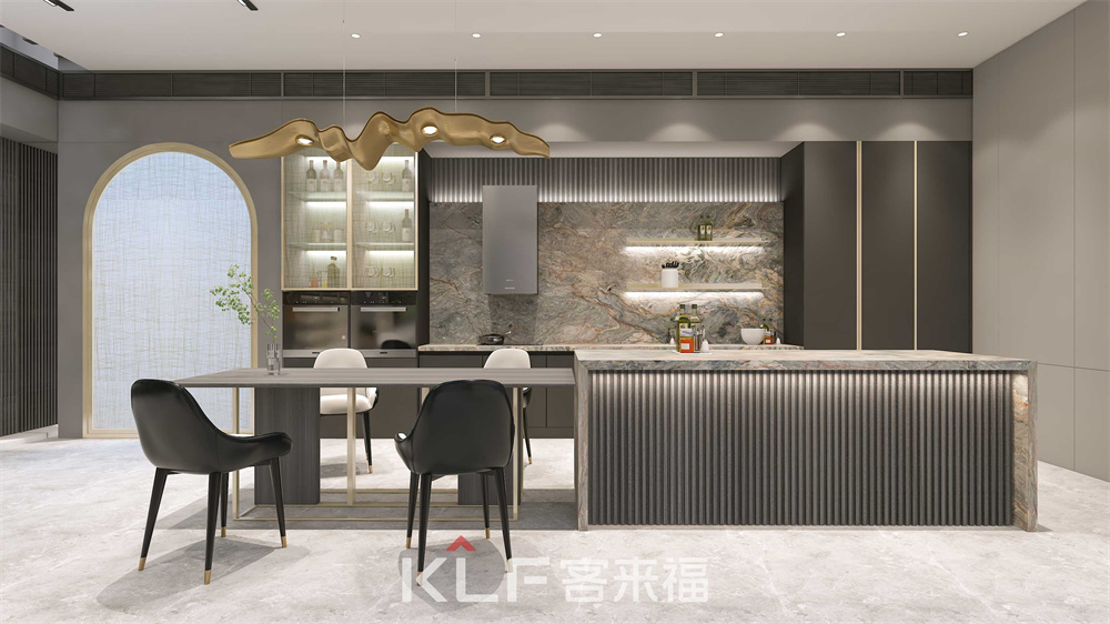 餐桌与岛台一体化连接,波纹的垂直设计,展现了餐厅空间的灵动感。冰箱采用内嵌式设计,外观风格更加统一美观。直筒油烟机将做饭时的油烟尽收其中,避免空间内大面积油烟四散,保持空间环境清洁干爽。